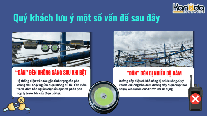 Một trong những sự cố thường gặp nhất khi vận hành dàn đèn đánh cá là tình trạng đèn không sáng sau khi đã bật công tắc. Nguyên nhân chính dẫn đến tình trạng này. Thường xuất phát từ hệ thống điện trên tàu gặp tình trạng cân pha không đều hoặc nguồn điện không đủ tải.