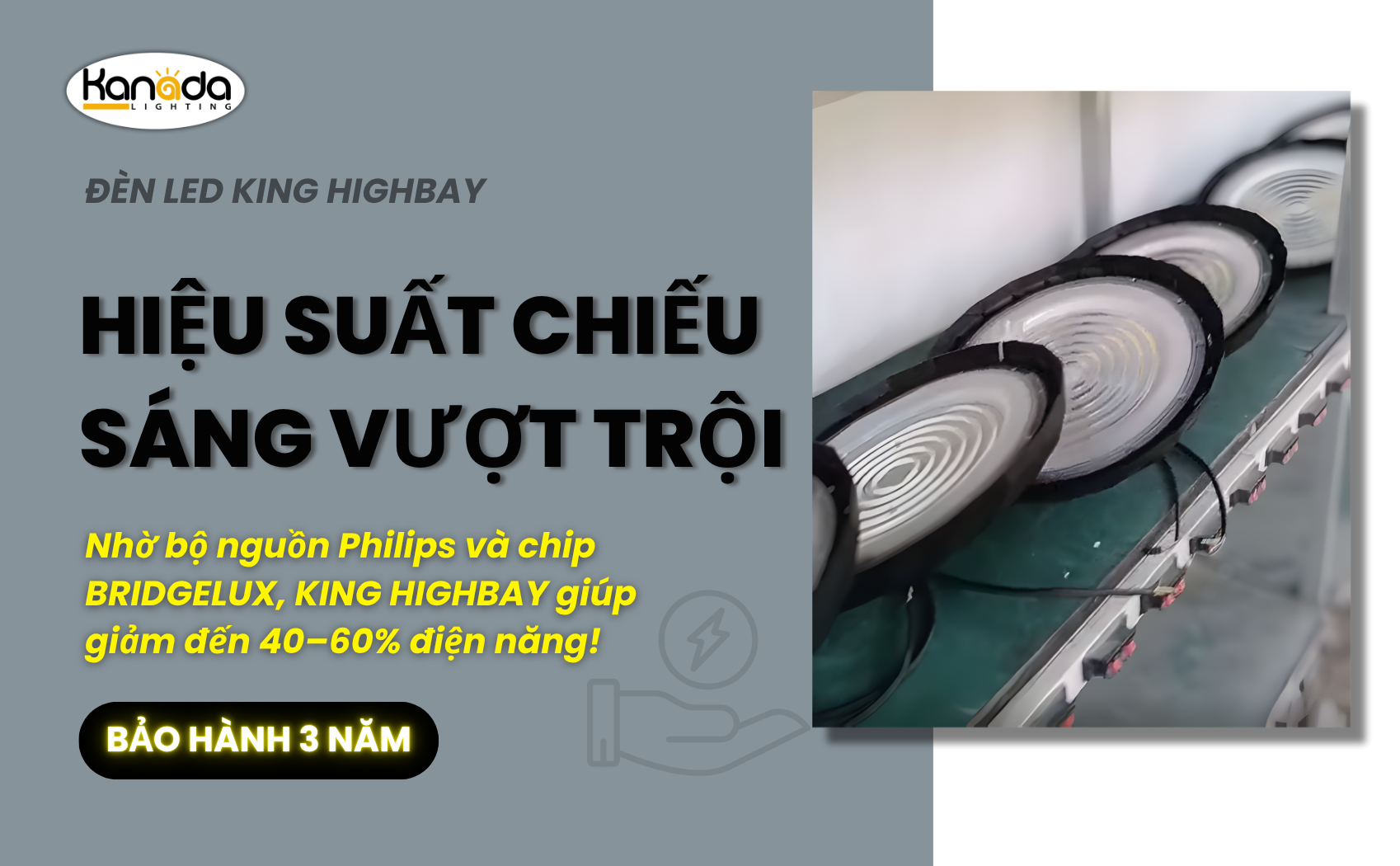 Với hiệu suất chiếu sáng vượt trội, độ bền cao và khả năng tiết kiệm điện đáng kể, KING HIGHBAY là lựa chọn hàng đầu của doanh nghiệp cần giải pháp chiếu sáng ổn định – kinh tế – bền bỉ lâu dài.