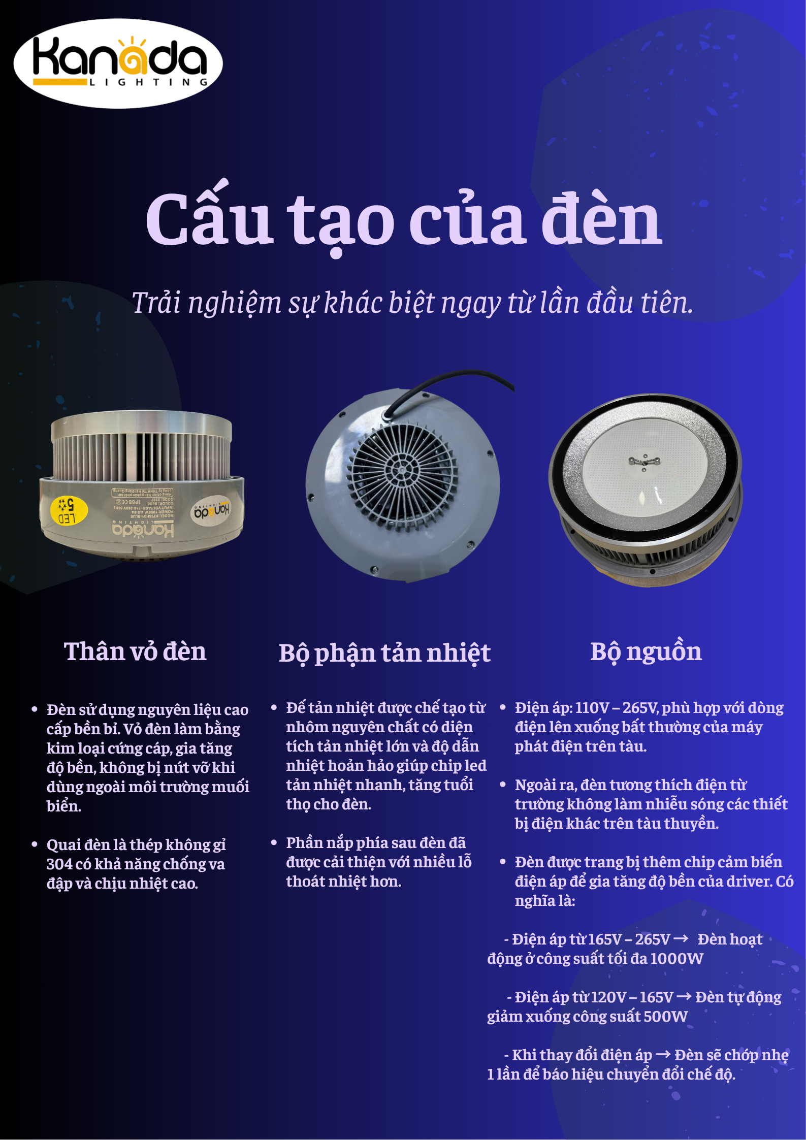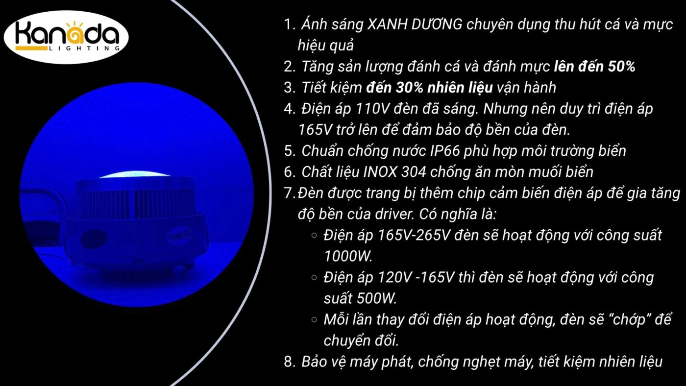 Đèn LED đánh cá và mực xanh dương 1000W KANADA ra đời không phải để thay thế, mà để bổ trợ và nâng cao hiệu quả cho đèn xanh lam lục trong hoạt động đánh bắt – đặc biệt là câu mực và thu hút sinh vật phù du ở một số vùng biển.